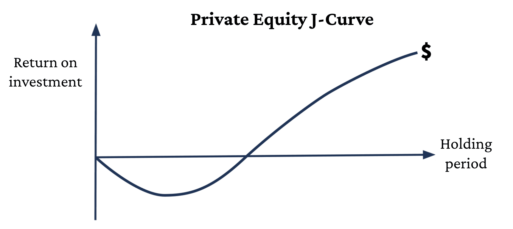 The J-curve refers to the typical performance pattern of a private equity investment over time. In the early years, returns often dip into negative territory before rising sharply in later stages. This creates a curve shaped like the letter “J.”